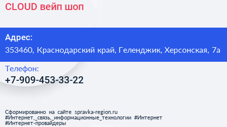 CLOUD, вейп-шоп по адресу 353460, Краснодарский край, Геленджик, Херсонская, 7а в дальнейшем Организация, размещена в следующих категориях: