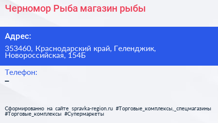 Черномор Рыба, магазин рыбы по адресу 353460, Краснодарский край, Геленджик, Новороссийская, 154Б в дальнейшем Организация, размещена в следующих категориях: