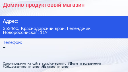 Домино, продуктовый магазин по адресу 353460, Краснодарский край, Геленджик, Новороссийская, 119 в дальнейшем Организация, размещена в следующих категориях: