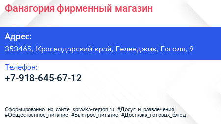 Фанагория, фирменный магазин по адресу 353465, Краснодарский край, Геленджик, Гоголя, 9 в дальнейшем Организация, размещена в следующих категориях: