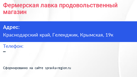 Фермерская лавка, продовольственный магазин по адресу Краснодарский край, Геленджик, Крымская, 19к в дальнейшем Организация, размещена в следующих категориях: