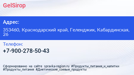 GelSirop по адресу 353460, Краснодарский край, Геленджик, Кабардинская, 26 в дальнейшем Организация, размещена в следующих категориях: