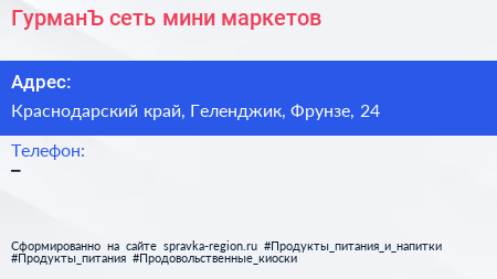 ГурманЪ, сеть мини-маркетов по адресу Краснодарский край, Геленджик, Фрунзе, 24 в дальнейшем Организация, размещена в следующих категориях: