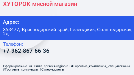 ХУТОРОК, мясной магазин по адресу 353477, Краснодарский край, Геленджик, Солнцедарская, 2д в дальнейшем Организация, размещена в следующих категориях: