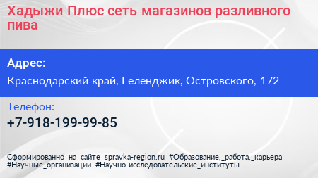 Хадыжи Плюс, сеть магазинов разливного пива по адресу Краснодарский край, Геленджик, Островского, 172 в дальнейшем Организация, размещена в следующих категориях: