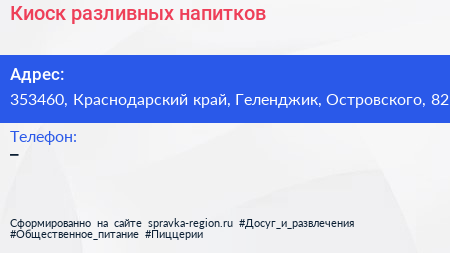 Киоск разливных напитков по адресу 353460, Краснодарский край, Геленджик, Островского, 82 в дальнейшем Организация, размещена в следующих категориях: