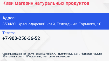 Киви, магазин натуральных продуктов по адресу 353460, Краснодарский край, Геленджик, Горького, 10 в дальнейшем Организация, размещена в следующих категориях: