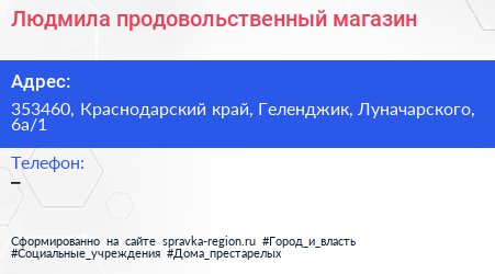 Людмила, продовольственный магазин по адресу 353460, Краснодарский край, Геленджик, Луначарского, 6а/1 в дальнейшем Организация, размещена в следующих категориях: