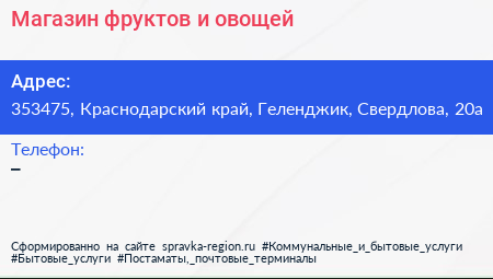 Магазин фруктов и овощей по адресу 353475, Краснодарский край, Геленджик, Свердлова, 20а в дальнейшем Организация, размещена в следующих категориях: