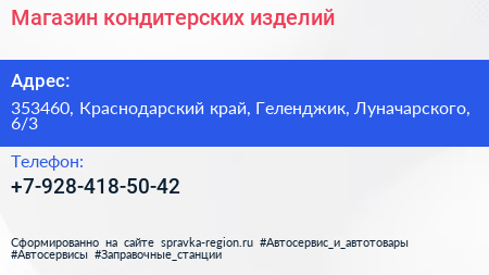 Магазин кондитерских изделий по адресу 353460, Краснодарский край, Геленджик, Луначарского, 6/3 в дальнейшем Организация, размещена в следующих категориях: