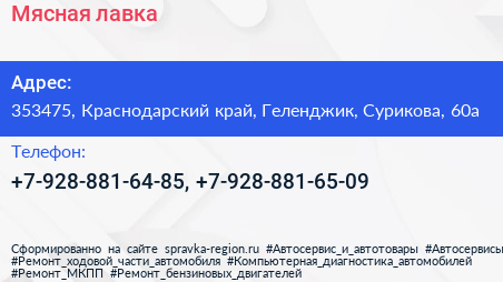 Мясная лавка по адресу 353475, Краснодарский край, Геленджик, Сурикова, 60а в дальнейшем Организация, размещена в следующих категориях: