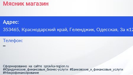 Мясник, магазин по адресу 353465, Краснодарский край, Геленджик, Одесская, 3а к12 в дальнейшем Организация, размещена в следующих категориях: