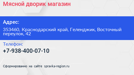 Мясной дворик, магазин по адресу 353460, Краснодарский край, Геленджик, Восточный переулок, 42 в дальнейшем Организация, размещена в следующих категориях: