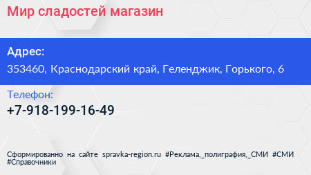 Мир сладостей, магазин по адресу 353460, Краснодарский край, Геленджик, Горького, 6 в дальнейшем Организация, размещена в следующих категориях: