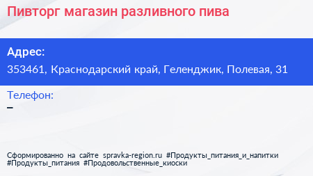 Пивторг, магазин разливного пива по адресу 353461, Краснодарский край, Геленджик, Полевая, 31 в дальнейшем Организация, размещена в следующих категориях:
