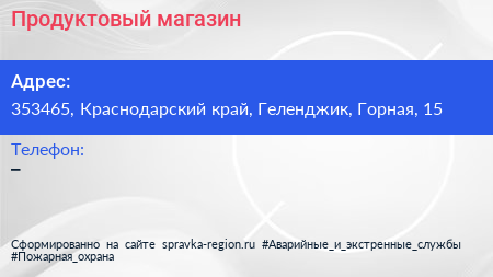 Продуктовый магазин по адресу 353465, Краснодарский край, Геленджик, Горная, 15 в дальнейшем Организация, размещена в следующих категориях: