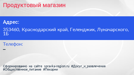 Продуктовый магазин по адресу 353460, Краснодарский край, Геленджик, Луначарского, 1Б в дальнейшем Организация, размещена в следующих категориях: