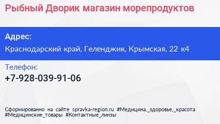 Рыбный Дворик, магазин морепродуктов по адресу Краснодарский край, Геленджик, Крымская, 22 к4 в дальнейшем Организация, размещена в следующих категориях: