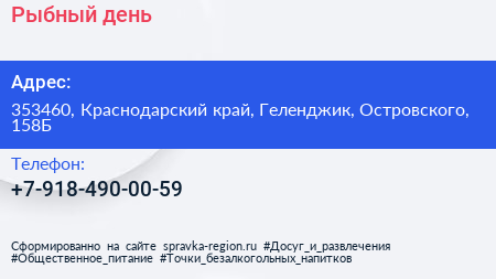 Рыбный день по адресу 353460, Краснодарский край, Геленджик, Островского, 158Б в дальнейшем Организация, размещена в следующих категориях: