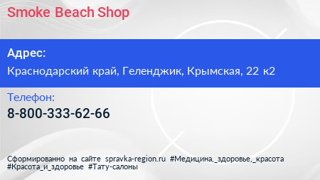 Smoke Beach Shop по адресу Краснодарский край, Геленджик, Крымская, 22 к2 в дальнейшем Организация, размещена в следующих категориях: