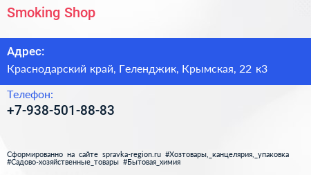 Smoking Shop по адресу Краснодарский край, Геленджик, Крымская, 22 к3 в дальнейшем Организация, размещена в следующих категориях: