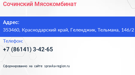 Сочинский Мясокомбинат по адресу 353460, Краснодарский край, Геленджик, Тельмана, 146/2 в дальнейшем Организация, размещена в следующих категориях: