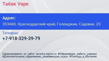 Табак & Vape по адресу 353460, Краснодарский край, Геленджик, Садовая, 23 в дальнейшем Организация, размещена в следующих категориях:
