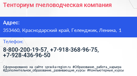 Тенториум, пчеловодческая компания по адресу 353460, Краснодарский край, Геленджик, Ленина, 1 в дальнейшем Организация, размещена в следующих категориях:
