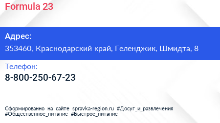 Formula 23 по адресу 353460, Краснодарский край, Геленджик, Шмидта, 8 в дальнейшем Организация, размещена в следующих категориях: