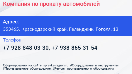 Компания по прокату автомобилей по адресу 353465, Краснодарский край, Геленджик, Гоголя, 13 в дальнейшем Организация, размещена в следующих категориях: