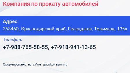 Компания по прокату автомобилей по адресу 353460, Краснодарский край, Геленджик, Тельмана, 135к в дальнейшем Организация, размещена в следующих категориях: