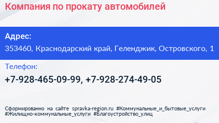 Компания по прокату автомобилей по адресу 353460, Краснодарский край, Геленджик, Островского, 1 в дальнейшем Организация, размещена в следующих категориях: