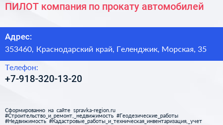 ПИЛОТ, компания по прокату автомобилей по адресу 353460, Краснодарский край, Геленджик, Морская, 35 в дальнейшем Организация, размещена в следующих категориях: