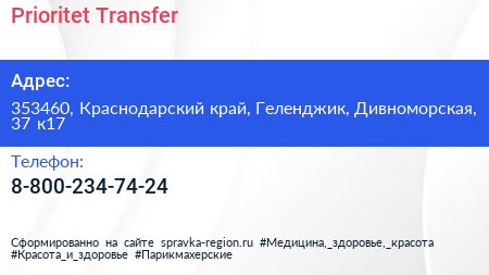 Prioritet Transfer по адресу 353460, Краснодарский край, Геленджик, Дивноморская, 37 к17 в дальнейшем Организация, размещена в следующих категориях: