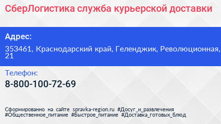 СберЛогистика, служба курьерской доставки по адресу 353461, Краснодарский край, Геленджик, Революционная, 21 в дальнейшем Организация, размещена в следующих категориях: