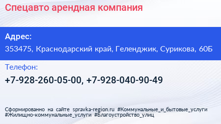 Спецавто, арендная компания по адресу 353475, Краснодарский край, Геленджик, Сурикова, 60Б в дальнейшем Организация, размещена в следующих категориях: