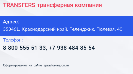 TRANSFERS, трансферная компания по адресу 353461, Краснодарский край, Геленджик, Полевая, 40 в дальнейшем Организация, размещена в следующих категориях: