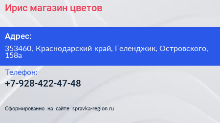 Ирис, магазин цветов по адресу 353460, Краснодарский край, Геленджик, Островского, 158а в дальнейшем Организация, размещена в следующих категориях: