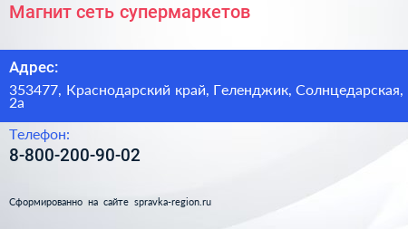 Магнит, сеть супермаркетов по адресу 353477, Краснодарский край, Геленджик, Солнцедарская, 2а в дальнейшем Организация, размещена в следующих категориях:
