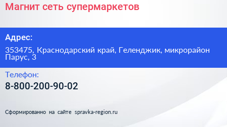 Магнит, сеть супермаркетов по адресу 353475, Краснодарский край, Геленджик, микрорайон Парус, 3 в дальнейшем Организация, размещена в следующих категориях: