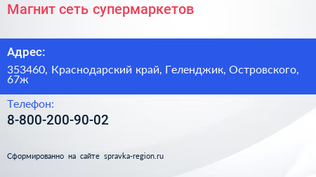 Магнит, сеть супермаркетов по адресу 353460, Краснодарский край, Геленджик, Островского, 67ж в дальнейшем Организация, размещена в следующих категориях: