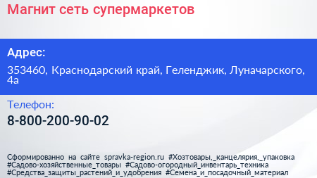 Магнит, сеть супермаркетов по адресу 353460, Краснодарский край, Геленджик, Луначарского, 4а в дальнейшем Организация, размещена в следующих категориях: