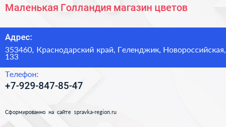 Маленькая Голландия, магазин цветов по адресу 353460, Краснодарский край, Геленджик, Новороссийская, 133 в дальнейшем Организация, размещена в следующих категориях: