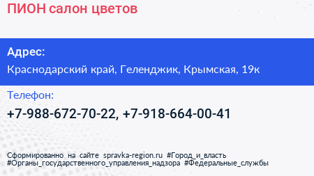 ПИОН, салон цветов по адресу Краснодарский край, Геленджик, Крымская, 19к в дальнейшем Организация, размещена в следующих категориях: