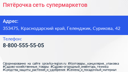 Пятёрочка, сеть супермаркетов по адресу 353475, Краснодарский край, Геленджик, Сурикова, 42 в дальнейшем Организация, размещена в следующих категориях: