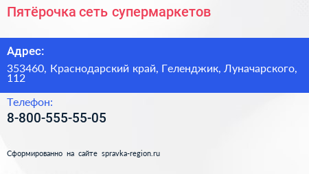 Пятёрочка, сеть супермаркетов по адресу 353460, Краснодарский край, Геленджик, Луначарского, 112 в дальнейшем Организация, размещена в следующих категориях: