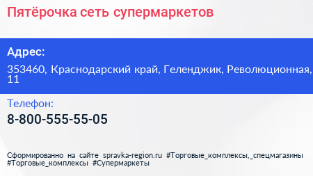 Пятёрочка, сеть супермаркетов по адресу 353460, Краснодарский край, Геленджик, Революционная, 11 в дальнейшем Организация, размещена в следующих категориях: