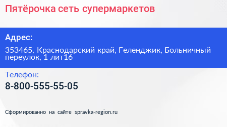 Пятёрочка, сеть супермаркетов по адресу 353465, Краснодарский край, Геленджик, Больничный переулок, 1 лит16 в дальнейшем Организация, размещена в следующих категориях: