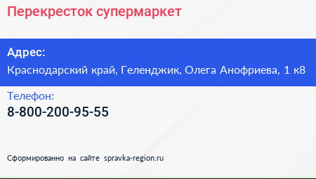 Перекресток, супермаркет по адресу Краснодарский край, Геленджик, Олега Анофриева, 1 к8 в дальнейшем Организация, размещена в следующих категориях: