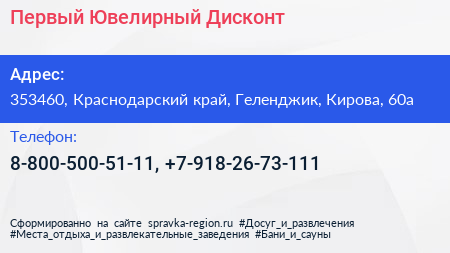 Первый Ювелирный Дисконт по адресу 353460, Краснодарский край, Геленджик, Кирова, 60а в дальнейшем Организация, размещена в следующих категориях: